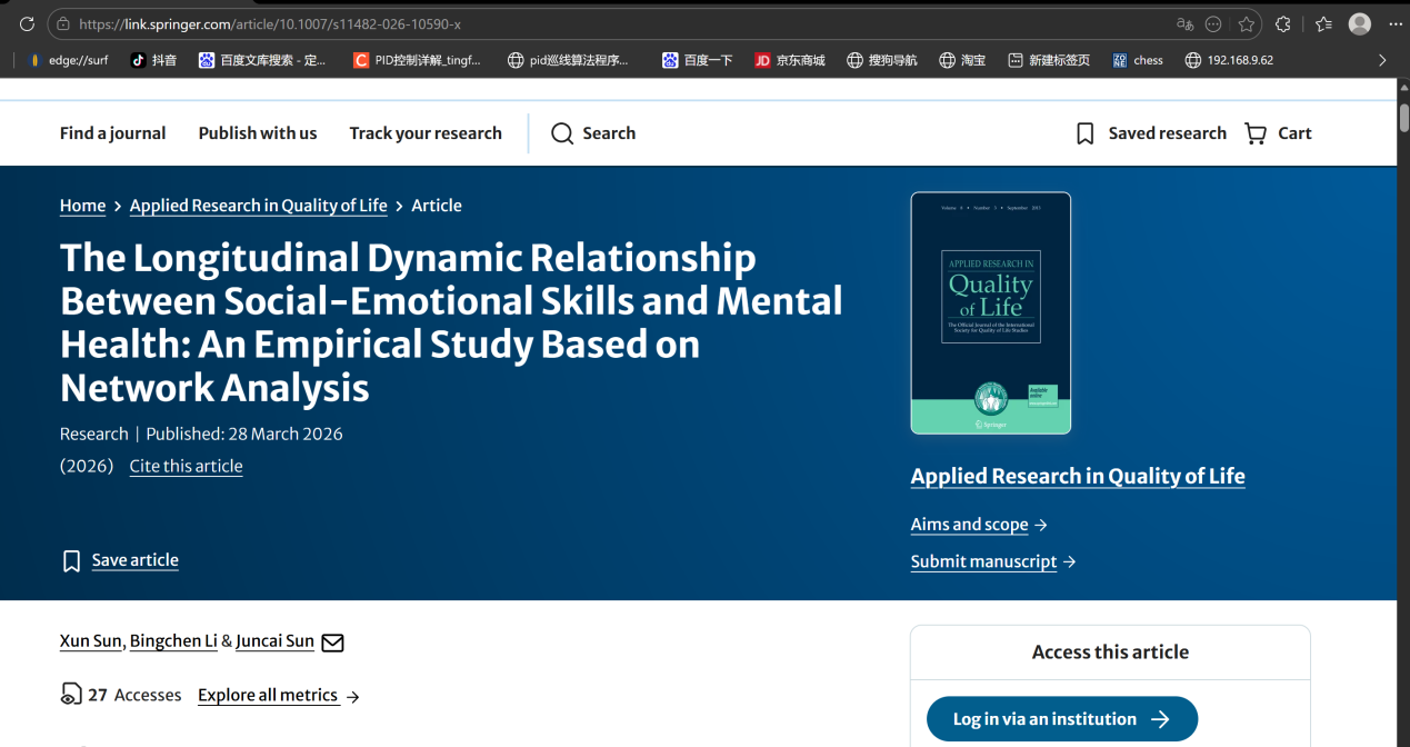 Xun Sun, Bingchen Li, Juncai Sun*. (2026). The Longitudinal Dynamic Relationship Between Social Emotional Skills and Mental Health: An Empirical Study Based on Network Analysis. Applied Research in Quality of Life. //doi.org/10.1007/s11482-026-10590-x