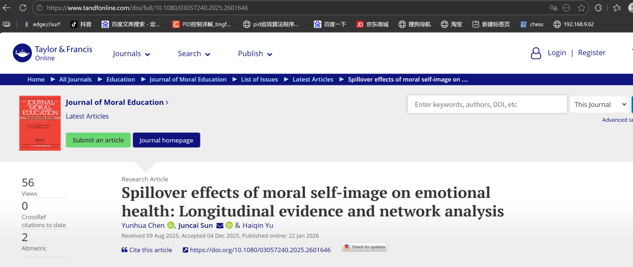 Yunhua Chen, Juncai Sun*,Haiqin Yu. (2026). Spillover effects of moral self-image on emotional health: Longitudinal evidence and network analysis, Journal of Moral Education. //doi.org/10.1080/03057240.2025.2601646