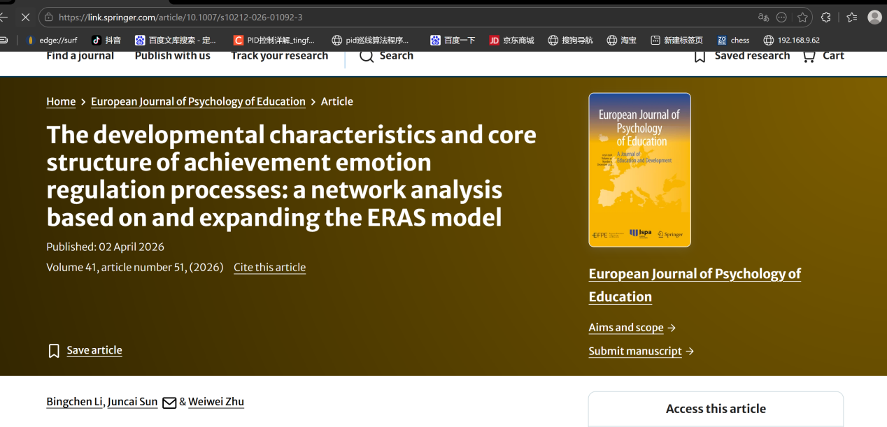 Bingchen Li, Juncai Sun*, Weiwei Zhu. (2026). The developmental characteristics and core structure of achievement emotion regulation processes: a network analysis based on and expanding the ERAS model. European Journal of Psychology of Education. //doi.org/10.1007/s10212-026-01092-3