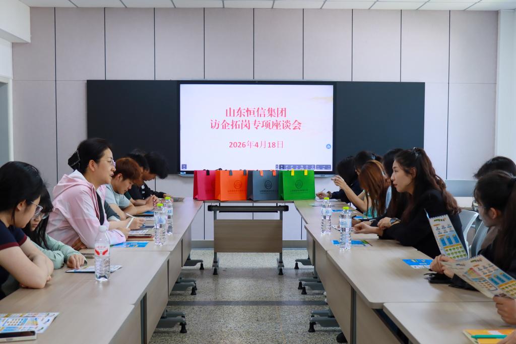 为深入贯彻落实高校毕业生就业工作部署,深化校企协同育人机制,精准对接优质企业人才需求,切实拓宽2026届毕业生高质量就业渠道,2026年4月18日,老虎机app下载页面 党委副书记朱伟卫、毕业班辅导员钱虹组织老虎机app 有求职意向的优秀毕业生代表,与山东恒信集团开展访企拓岗专项座谈交流。山东恒信集团人才发展中心单超超、张蔓热情参与座谈,双方围绕企业招聘需求、人才培养合作、毕业生就业对接等议题展开深入探讨。
