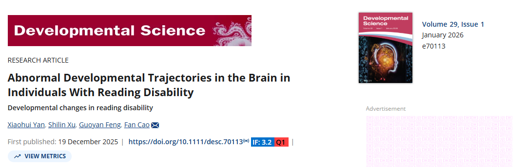 论文信息:Yan, X., S.Xu, G.Feng, and F.Cao. (2026). “Abnormal Developmental Trajectories in the Brain in Individuals with Reading Disability.” Developmental Science29, no. 1: e70113. //doi.org/10.1111/desc.70113