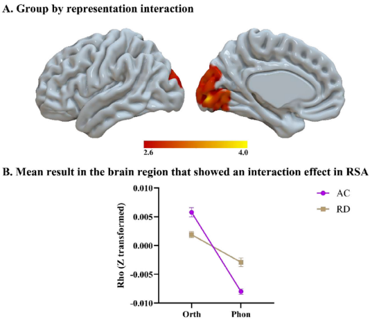 2RSA结果证实,该迁移与字形表征特化密切相关,阅读正常个体在枕颞区域对字形理论模型的表征相似性显著高于语音理论模型;而阅读障碍组对二者无差异,表明其左侧枕颞区域字形特异化进程异常(图3)。