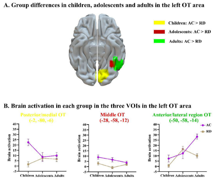 研究采用横断设计分别对五年级组、七年级组和成人组156名个体(包含阅读正常个体和阅读障碍个体)的大脑阅读网络的发展轨迹进行探究。研究综合运用基于fMRI的全脑分析、感兴趣区(ROI)分析、表征相似性分析(RSA)及脑-行为相关分析等多重方法,系统考察神经活动随年龄增长的动态模式。研究描绘出阅读正常个体和阅读障碍个体表现出不同的脑功能发展轨迹。